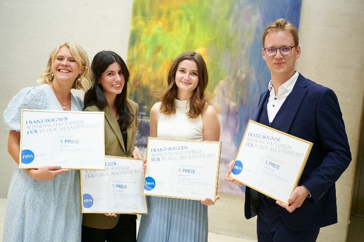 Wien - Gamze Görgülü, Daniel Gürtler, Clara Kaindel und Theresa Weis heißen die Sieger:innen, die sich in diesem Jahr über eine Erstplatzierung beim aktuellen Franz-Bogner-Wissenschaftspreises für Public Relations des PRVA freuen dürfen. In vier Kategorien wurden 37 wissenschaftliche Arbeiten aus dem Jahr 2022 eingereicht. Erstmalig so viele wie nie zuvor. Wichtigstes Kriterium für eine Einreichung ist ein Thema, das sich mit Öffentlichkeitsarbeit wissenschaftlich auseinandersetzt und idealerweise eine Lücke im Wissensbereich rund um PR und strategische Kommunikation schließt. Neun Arbeiten erhielten eine Auszeichnung, insgesamt wird ein Preisgeld von 8.300 Euro an die Geehrten als Anerkennung ihrer Leistungen ausgeschüttet.