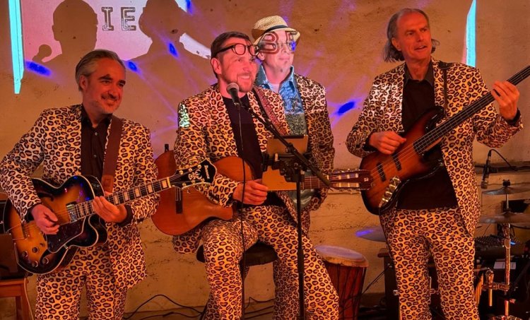 Im Leopardendress für rund 100 Geburtstagsgäste: Die Band „Liebe ohne Leiden“ mit Peter Kleemann (Pressesprecher Flughafen Wien), Peter N. Thier (ÖBB), Camillo Foramitti (ORF) und Günter Fritz („News“) (v. l.)