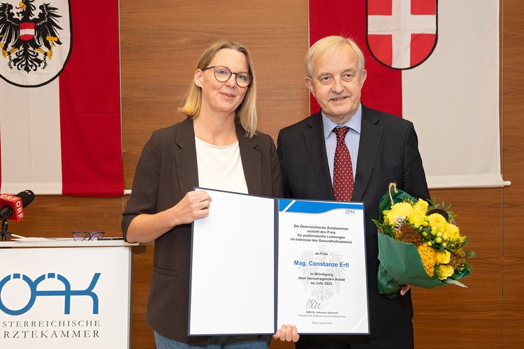 Wien - Der Präsident der Österreichischen Ärztekammer, Johannes Steinhart, vergab den „Preis für besondere publizistische Leistungen im Interesse des Gesundheitswesens“. Mit diesem zeichnet die ÖÄK seit vielen Jahren journalistische Arbeiten aus, die gesundheitspolitische Themen umfassend, faktentreu und nachvollziehbar darstellen. Für das Jahr 2024 wurden Constanze Ertl vom ORF und Christian Haberhauer von der APA für ihre intensive Berichterstattung zum Thema ME/CFS (Myalgische Enzephalomyelitis / Chronisches Fatigue Syndrom) prämiert. „Die Arbeiten der Preisträger zeichnen sich durch ein besonderes Maß an Aktualität, Objektivität und fundierter Recherche aus", erklärte Steinhart. Aufgrund einer Erkrankung nahm Christian Hammer von der APA stellvertretend für Christian Haberhauer den Preis entgegen.